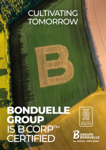 In 2023, we achieved certification for Bonduelle Italy and Bonduelle Americas (United States), representing 30% of our revenue. In 2024, additional entities in Europe were certified, bringing us to over 80% of our revenue. On January 12, 2026, we announced full certification. The goal set in 2018 has been reached: Bonduelle is 100% B Corp.